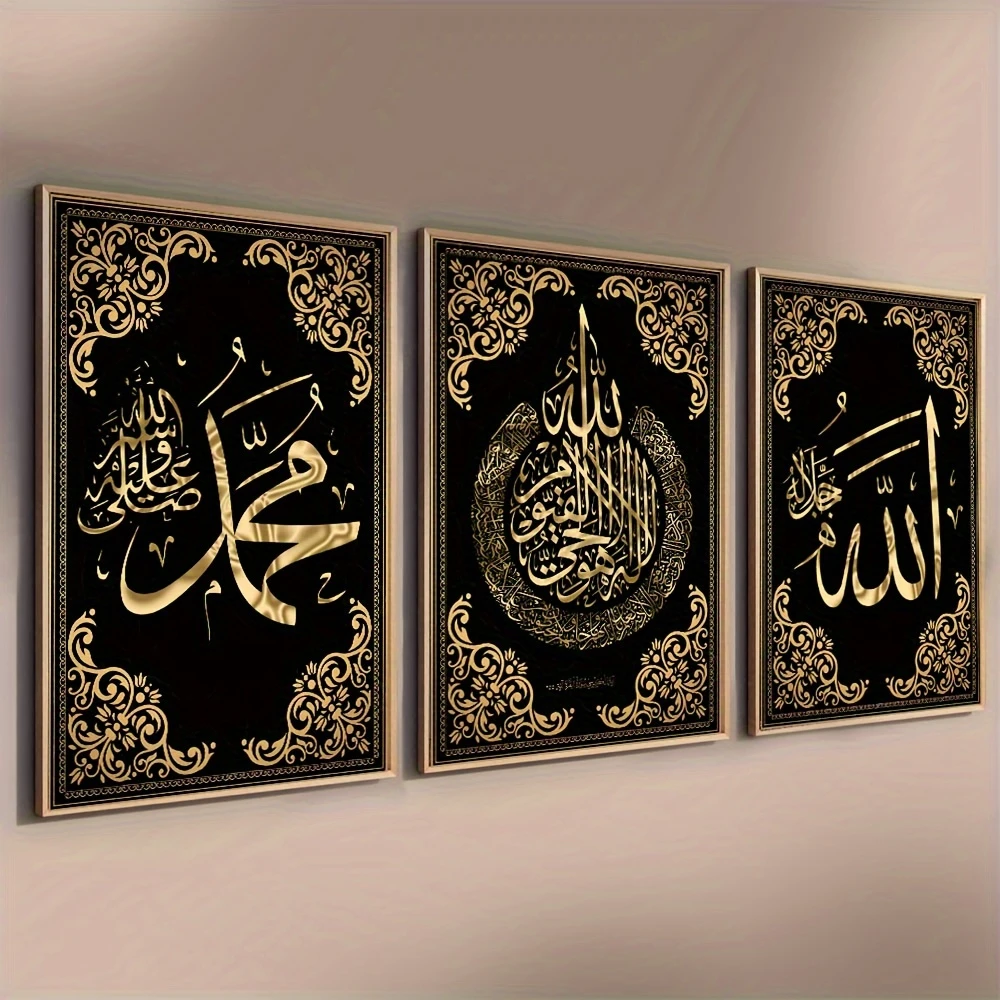 & Free ShippingSublimez votre intérieur avec ce triptyque islamique noir et or : calligraphies de Allah, la Shahada et Muhammad. Élégance et spiritualité réunies.